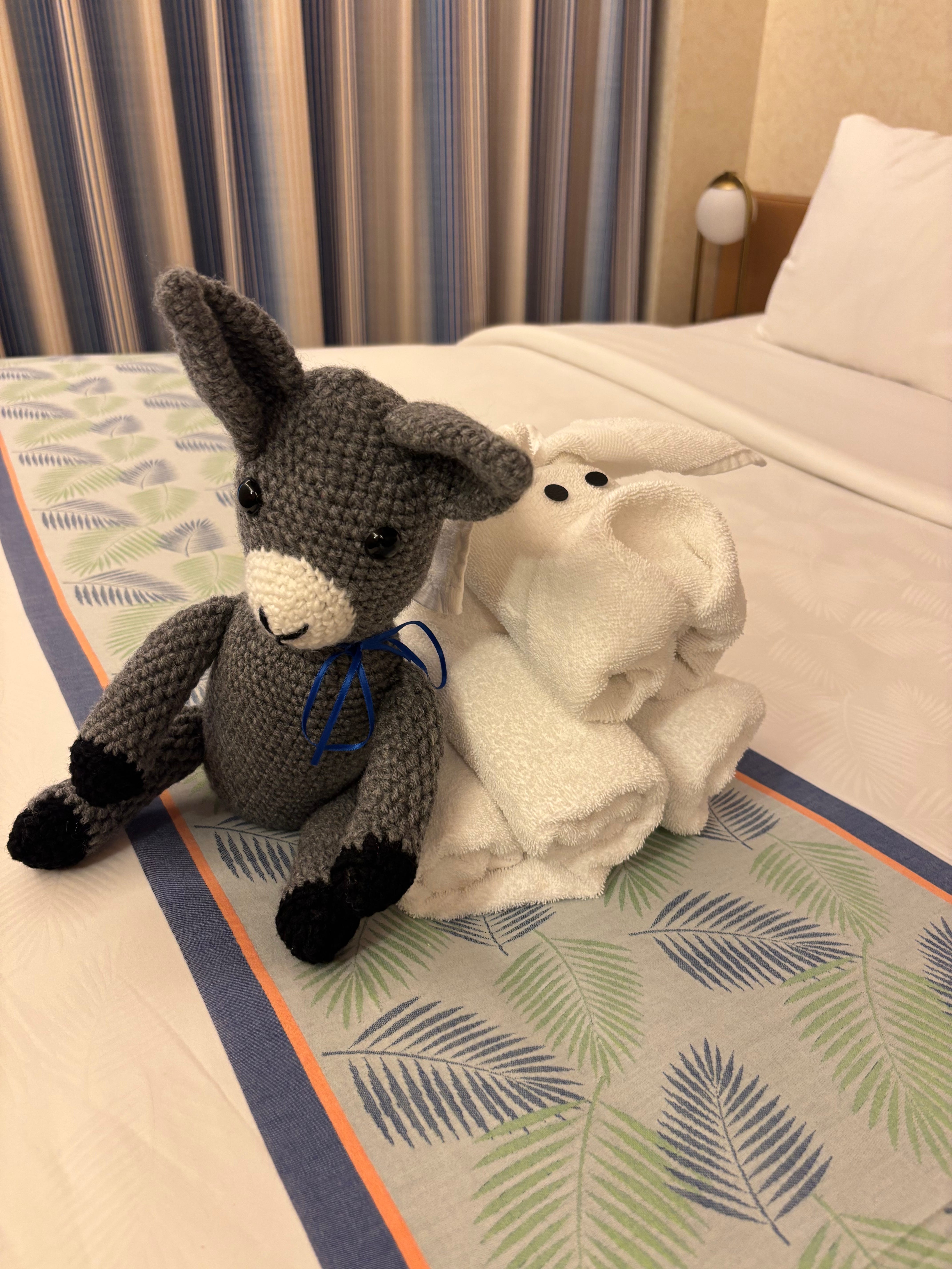 Here she is hanging out with one of the towel creatures our steward, Alvin from Indonesia, leaves on our bed every evening. I’m going to try to use her to make a little storybook for my granddaughter once we get to shore.