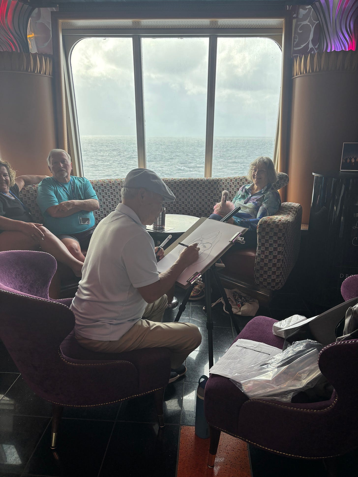 Hello from the balcony! It’s day nine on this Atlantic cruise. I was expecting to pay a visit to the Azores two days ago. But due to weather, we are cruising up and down the Straits of Gibraltar for awhile and will dock in Cartagena in Spain on Friday. In the meantime, I’m reading, working a puzzle, knitting, fine dining, going to shows, and checking out what else is going on around the ship. I finally got up early enough to see the caricature artist at work.
